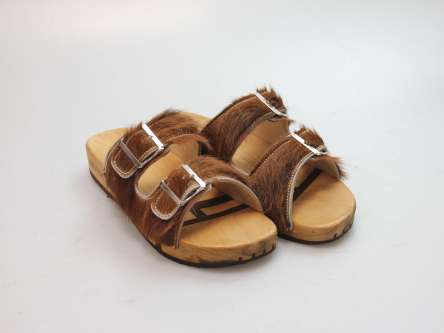 Holzsohle mit eingearbeitetem Fußbett. Die Laufsohle ist aus rutschfestem und abriebfestem PU. Durch die bewegliche Holzsohle ist die Sandale weich und leise beim Auftreten. Mittels zwei Schnallen kann sie dem Fuß perfekt angepasst werden.