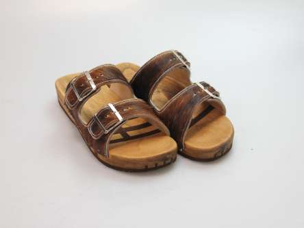 Holzsohle mit eingearbeitetem Fußbett. Die Laufsohle ist aus rutschfestem und abriebfestem PU. Durch die bewegliche Holzsohle ist die Sandale weich und leise beim Auftreten. Mittels zwei Schnallen kann sie dem Fuß perfekt angepasst werden.