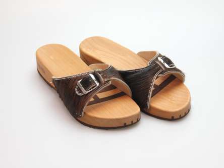 2-fach flexible Holzsohle. Obermaterial aus echtem Rindsfell, mit einem verstellbaren Riemen.