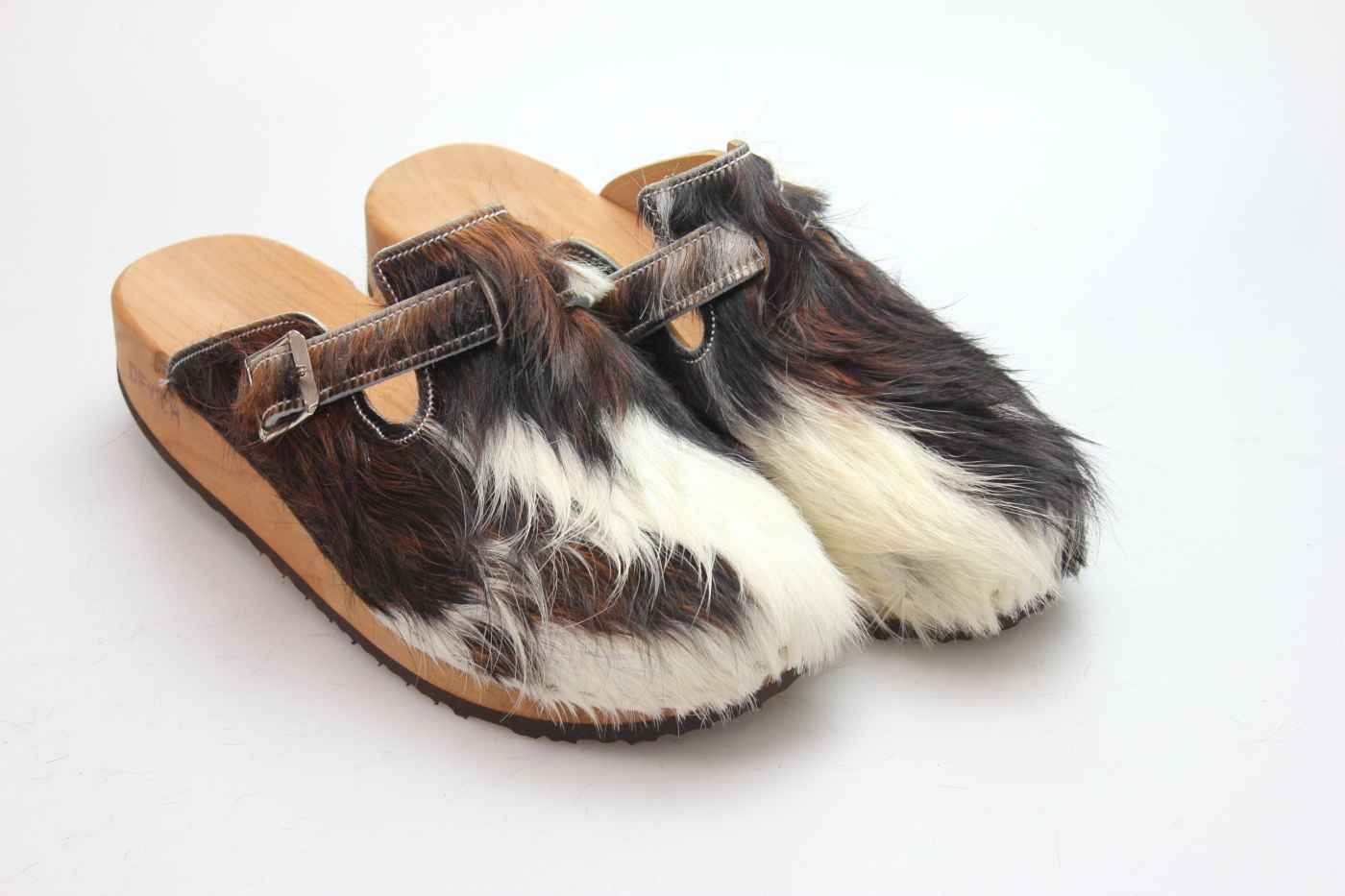 Das Obermaterial ist aus echtem Rindfell und in verschiedenen Farben erhältlich. Durch die Schnalle am Rist/Spann kann er dem Fuß angepasst werden.