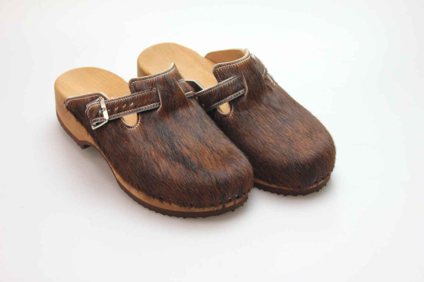 Die Holzsohle ist aus Pappelholz mit eingearbeitetem Fußbett und abriebfester Laufsohle. Das Oberleder ist aus echtem Rindfell. Durch die Schnalle am Rist/Spann kann er dem Fuß angepasst werden.