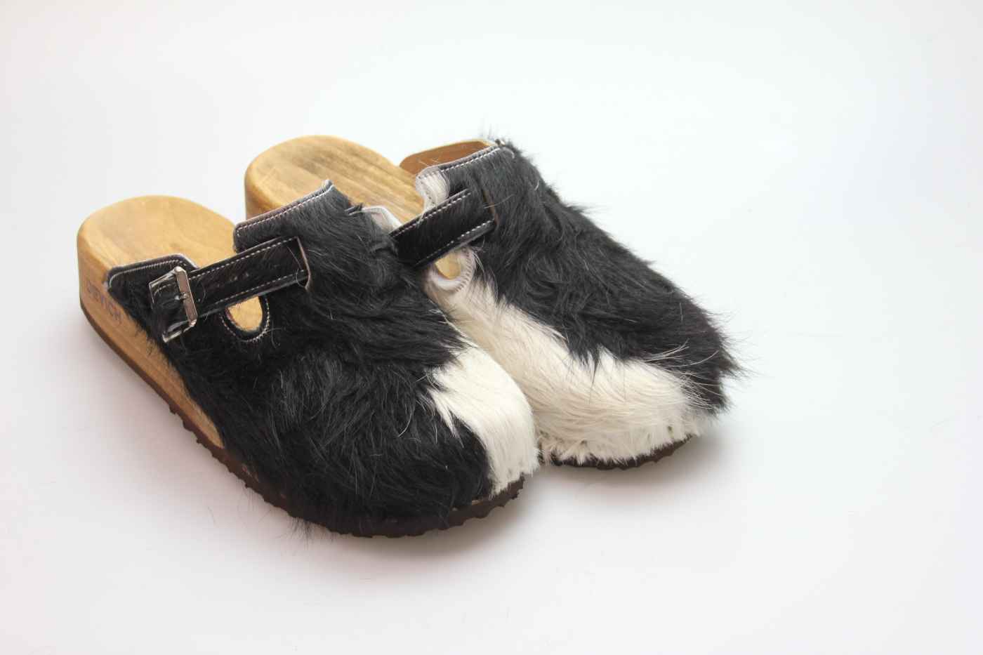 Das Obermaterial ist aus echtem Rindfell und in verschiedenen Farben erhältlich. Durch die Schnalle am Rist/Spann kann er dem Fuß angepasst werden. Im Bild sehen Sie das Exemplar, das Sie erhalten.