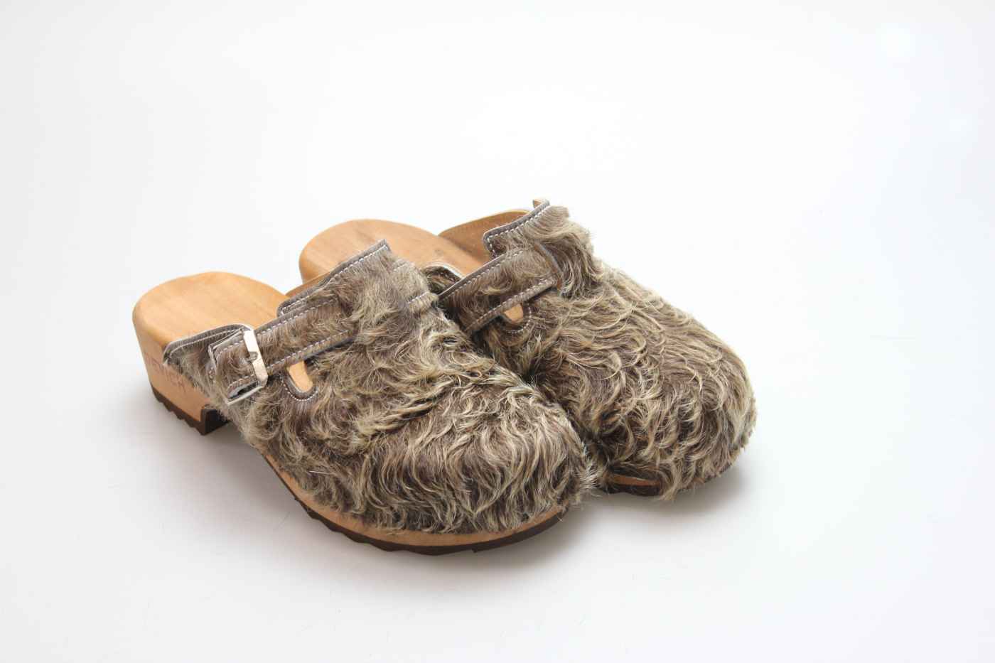 Die Holzsohle ist aus Pappelholz mit eingearbeitetem Fußbett und abriebfester Laufsohle. Das Oberleder ist aus echtem Rindfell. Durch die Schnalle am Rist/Spann kann er dem Fuß angepasst werden.