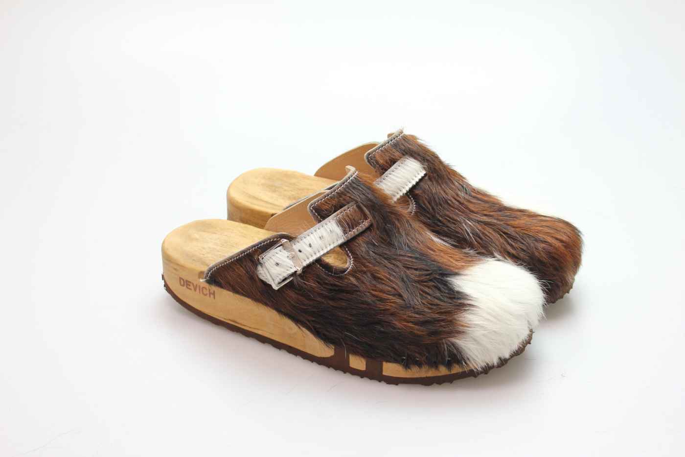 Das Obermaterial ist aus echtem Rindfell und in verschiedenen Farben erhältlich. Durch die Schnalle am Rist/Spann kann er dem Fuß angepasst werden. Im Bild sehen Sie das Exemplar, das Sie erhalten.