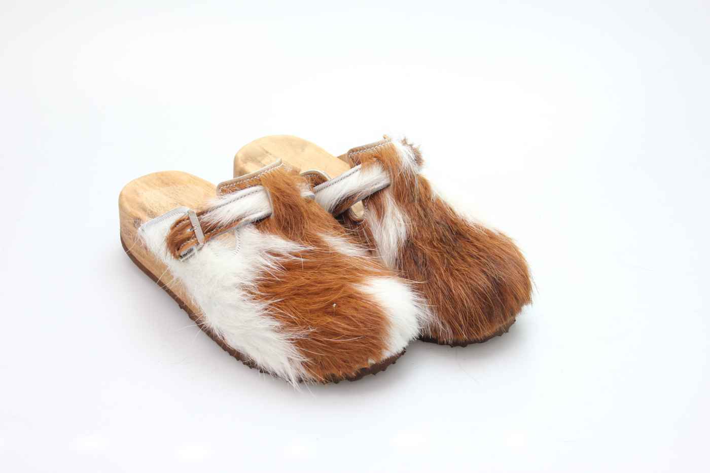 Das Obermaterial ist aus echtem Rindfell und in verschiedenen Farben erhältlich. Durch die Schnalle am Rist/Spann kann er dem Fuß angepasst werden. Im Bild sehen Sie das Exemplar, das Sie erhalten.