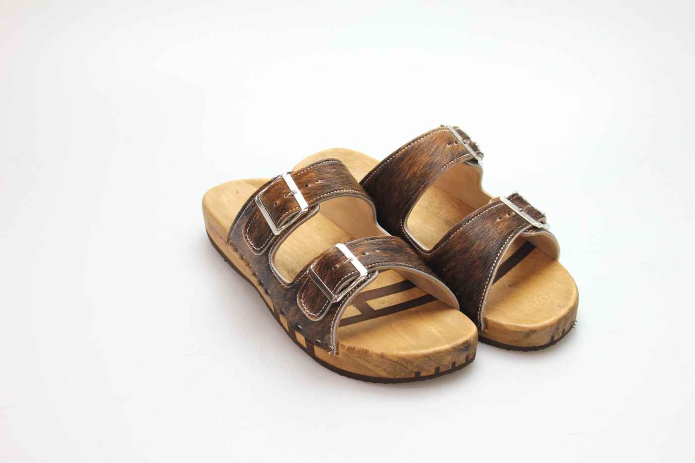 Holzsohle mit eingearbeitetem Fußbett. Die Laufsohle ist aus rutschfestem und abriebfestem PU. Durch die bewegliche Holzsohle ist die Sandale weich und leise beim Auftreten. Mittels zwei Schnallen kann sie dem Fuß perfekt angepasst werden.