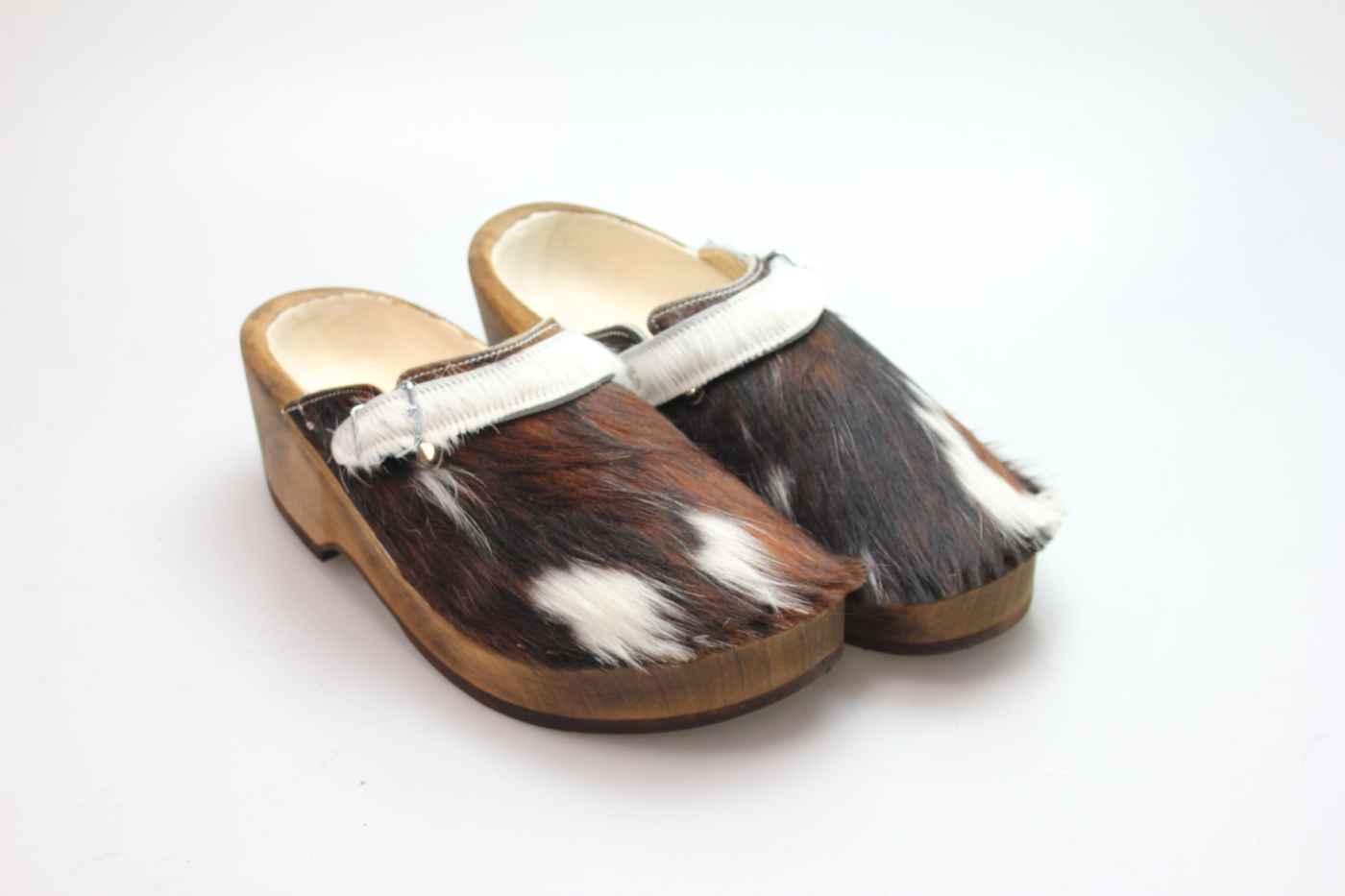 Dieser Holzschuh ist mittels einer Schnalle am Rist/Span verstellbar und ist mit einem Rindsleder gefüttert. Das Obermaterial ist echtes Rindfell. Im Bild sehen Sie das Unikat, welches Sie erhalten.