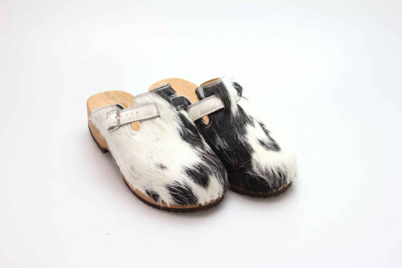 Die Holzsohle ist aus Pappelholz mit eingearbeitetem Fußbett und abriebfester Laufsohle. Das Oberleder ist aus echtem Rindfell. Durch die Schnalle am Rist/Spann kann er dem Fuß angepasst werden.