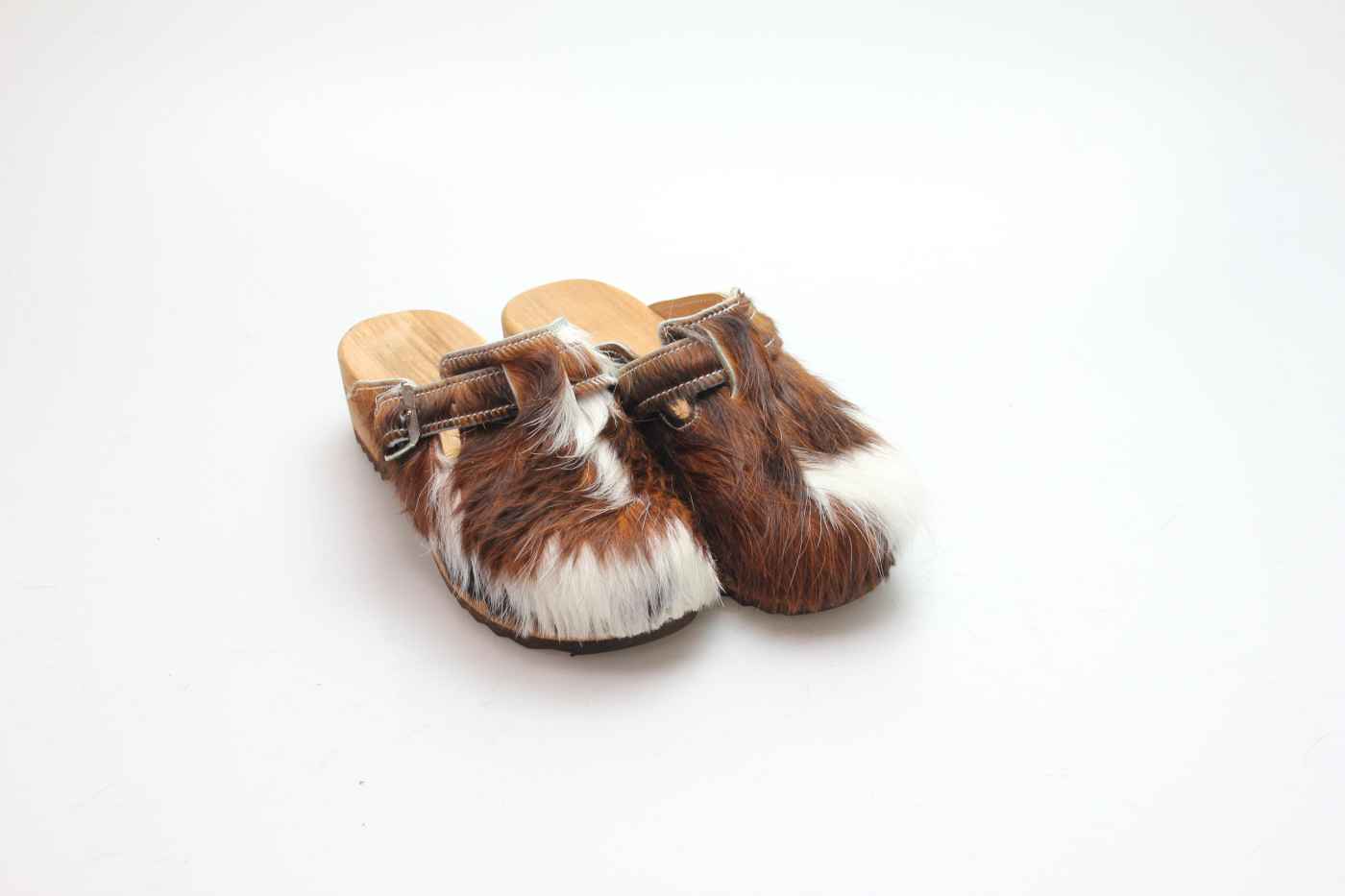 Die Holzsohle ist aus Pappelholz mit eingearbeitetem Fußbett und abriebfester Laufsohle. Das Oberleder ist aus echtem Rindfell. Durch die Schnalle am Rist/Spann kann er dem Fuß angepasst werden.