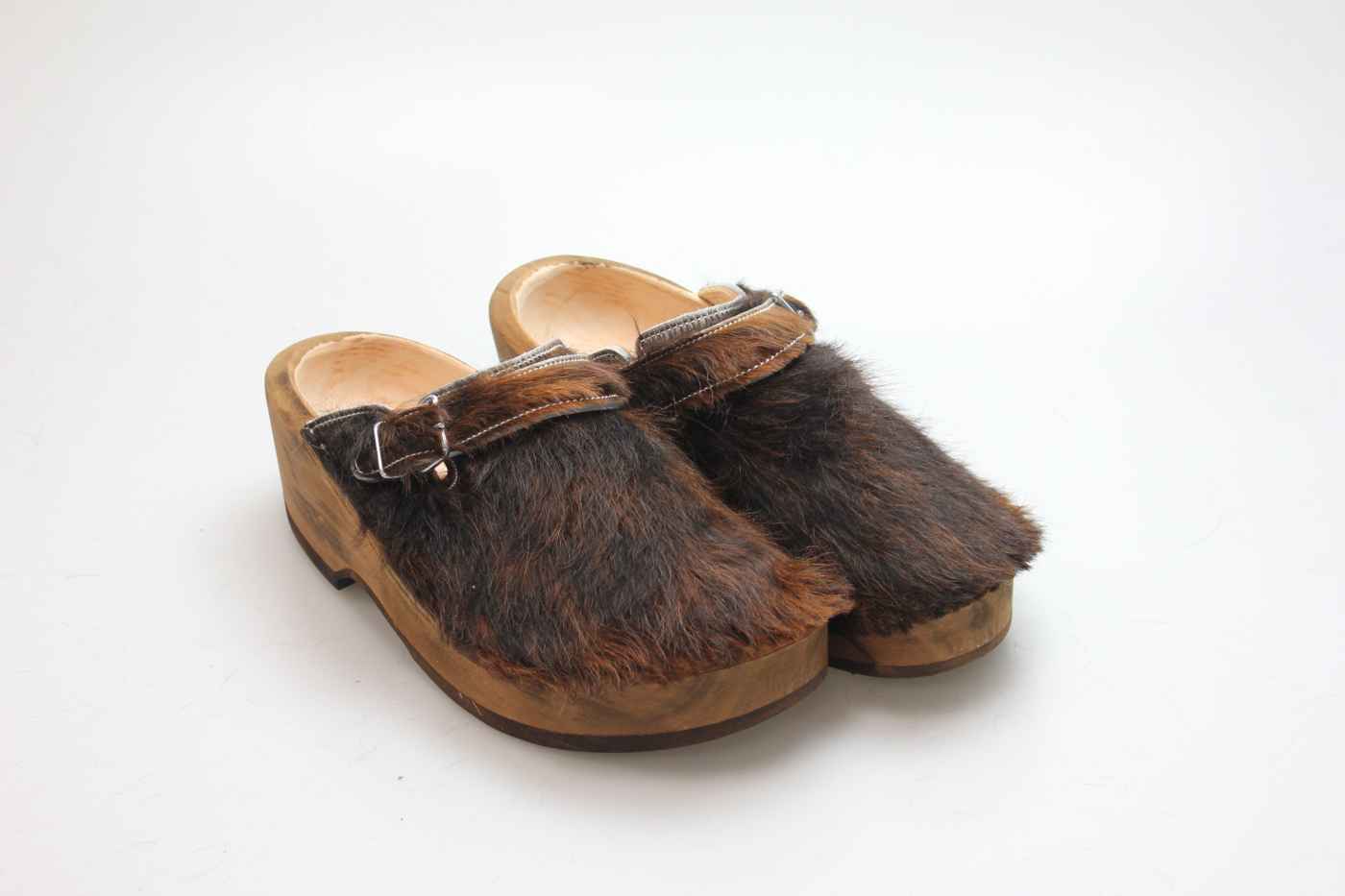 Dieser Holzschuh ist mittels einer Schnalle am Rist/Span verstellbar und ist mit einem Rindsleder gefüttert. Das Obermaterial ist echtes Rindfell. Im Bild sehen Sie das Unikat, welches Sie erhalten.