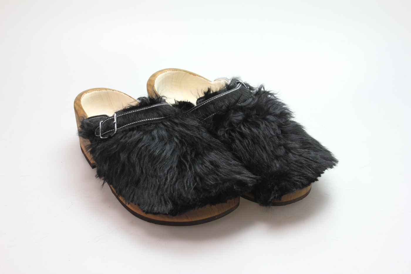 Der Holzschuh, mit dem Sie sicherlich auffallen werden. Außen verwenden wir für dieses Modell Ziegenfell. Für zusätzichen Komfort ist er auch mit Schaffell gefüttert. Im Bild sehen Sie das Unikat, welches Sie erhalten.