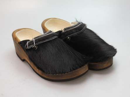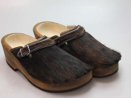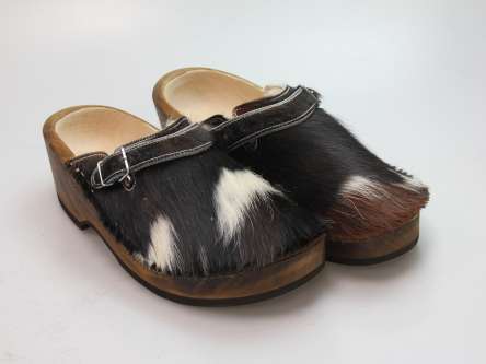 Dieser Holzschuh ist mittels einer Schnalle am Rist/Span verstellbar und ist mit einem Rindsleder gefüttert. Das Obermaterial ist echtes Rindfell. Im Bild sehen Sie das Unikat, welches Sie erhalten.