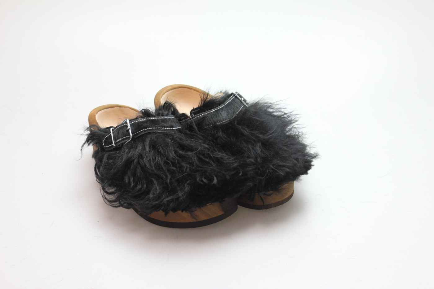 Der Holzschuh, mit dem Sie sicherlich auffallen werden. Außen verwenden wir für dieses Modell Ziegenfell. Für zusätzichen Komfort ist er auch mit Schaffell gefüttert. Im Bild sehen Sie das Unikat, welches Sie erhalten.