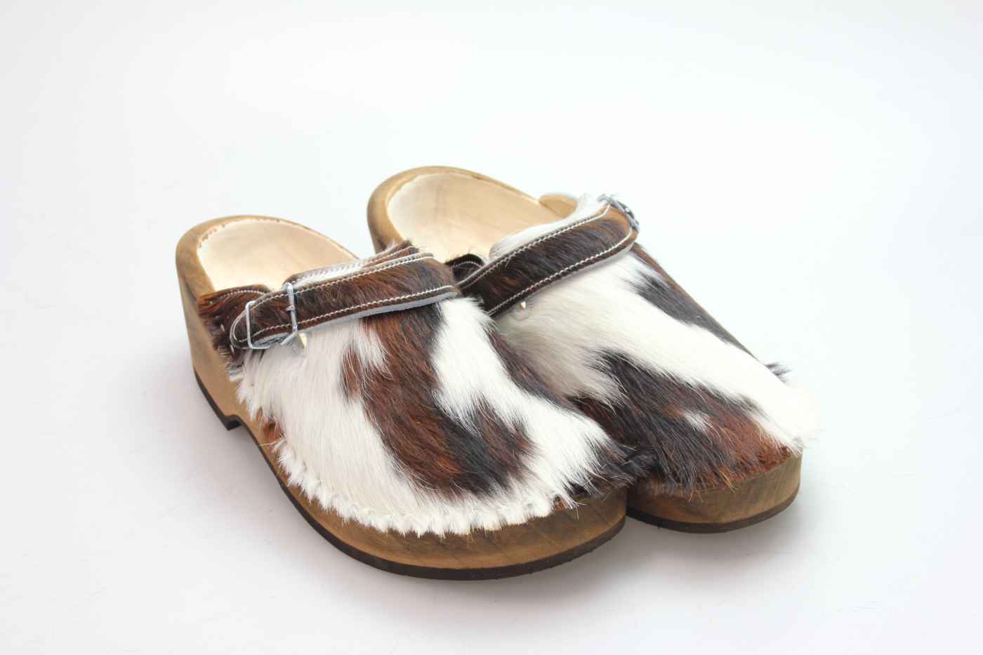 Dieser Holzschuh ist mittels einer Schnalle am Rist/Span verstellbar und ist mit einem Rindsleder gefüttert. Das Obermaterial ist echtes Rindfell. Im Bild sehen Sie das Unikat, welches Sie erhalten.