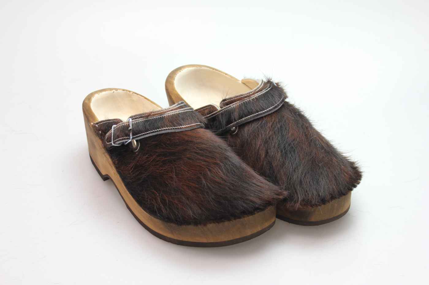 Dieser Holzschuh ist mittels einer Schnalle am Rist/Span verstellbar und ist mit einem Rindsleder gefüttert. Das Obermaterial ist echtes Rindfell. Im Bild sehen Sie das Unikat, welches Sie erhalten.