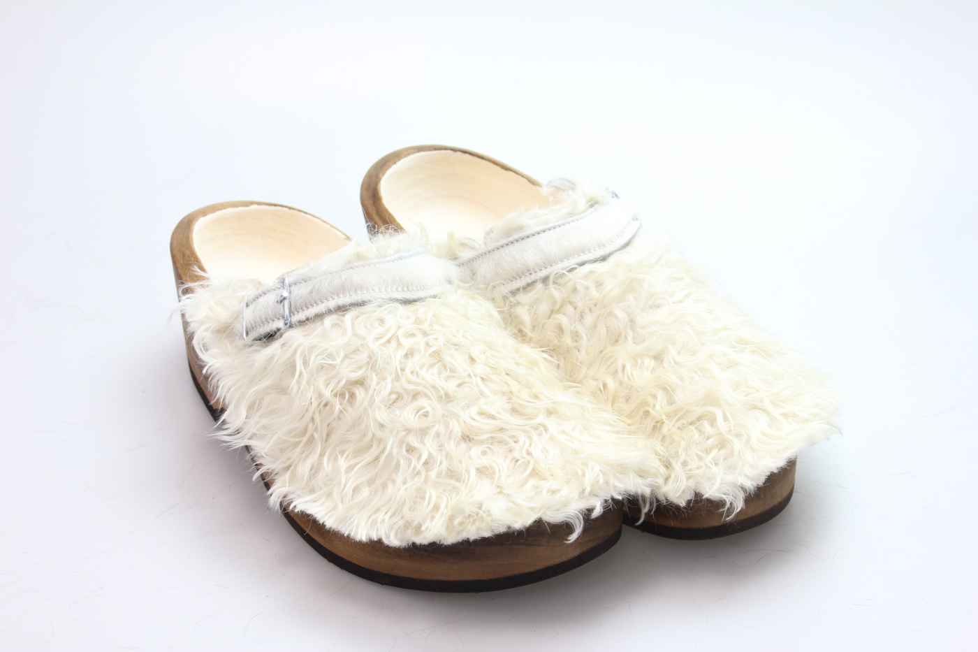 Der Holzschuh, mit dem Sie sicherlich auffallen werden. Außen verwenden wir für dieses Modell Ziegenfell. Für zusätzichen Komfort ist er auch mit Schaffell gefüttert. Im Bild sehen Sie das Unikat, welches Sie erhalten.