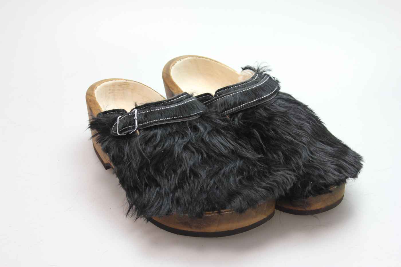 Der Holzschuh, mit dem Sie sicherlich auffallen werden. Außen verwenden wir für dieses Modell Ziegenfell. Für zusätzichen Komfort ist er auch mit Schaffell gefüttert. Im Bild sehen Sie das Unikat, welches Sie erhalten.