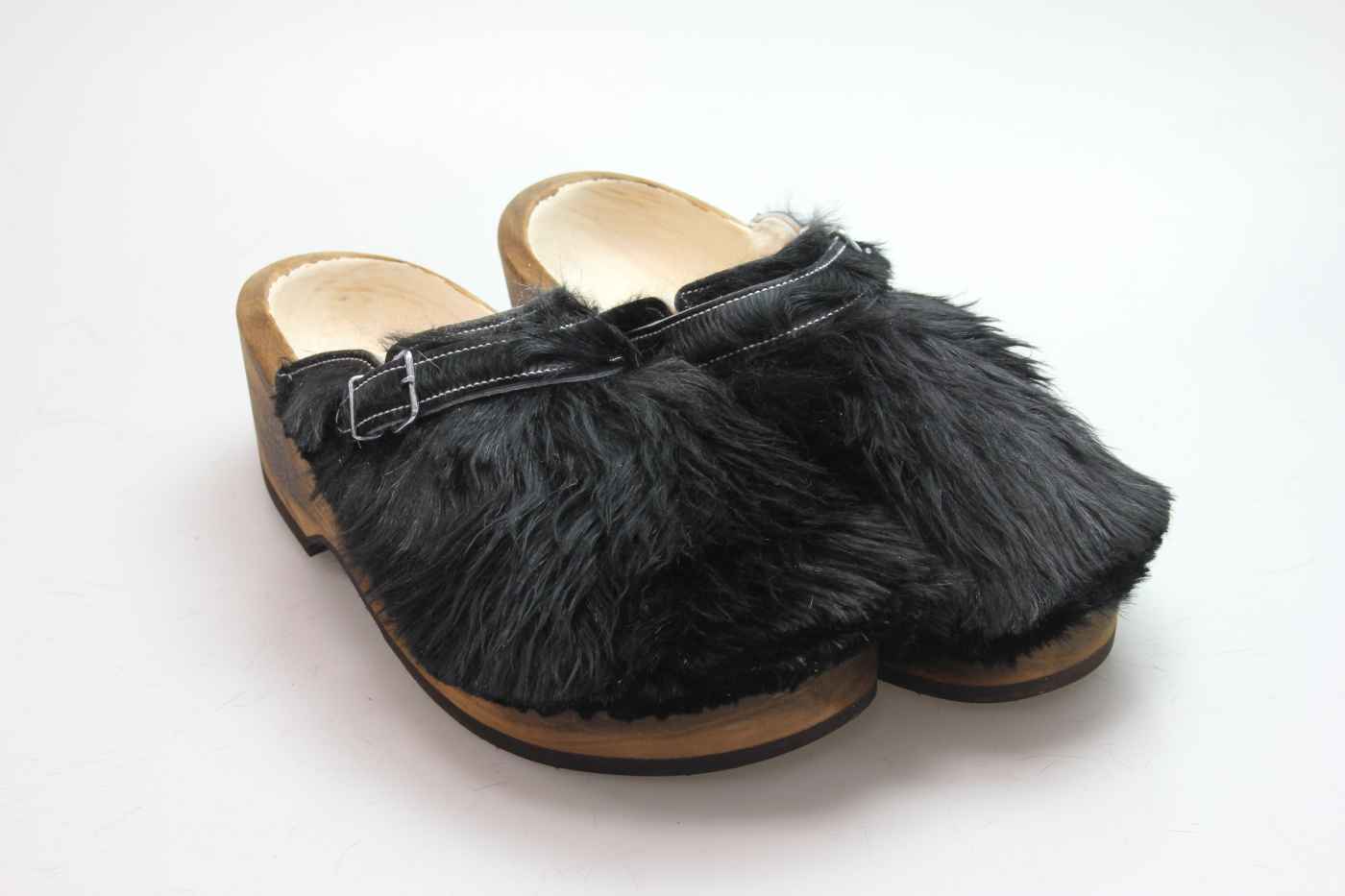 Der Holzschuh, mit dem Sie sicherlich auffallen werden. Außen verwenden wir für dieses Modell Ziegenfell. Für zusätzichen Komfort ist er auch mit Schaffell gefüttert. Im Bild sehen Sie das Unikat, welches Sie erhalten.
