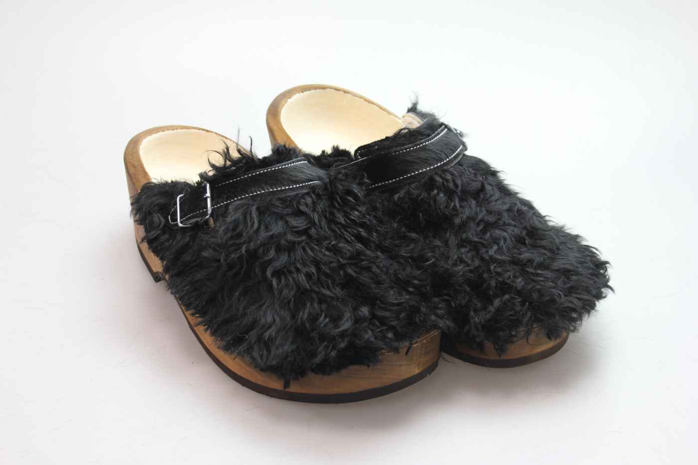 Der Holzschuh, mit dem Sie sicherlich auffallen werden. Außen verwenden wir für dieses Modell Ziegenfell. Für zusätzichen Komfort ist er auch mit Schaffell gefüttert. Im Bild sehen Sie das Unikat, welches Sie erhalten.
