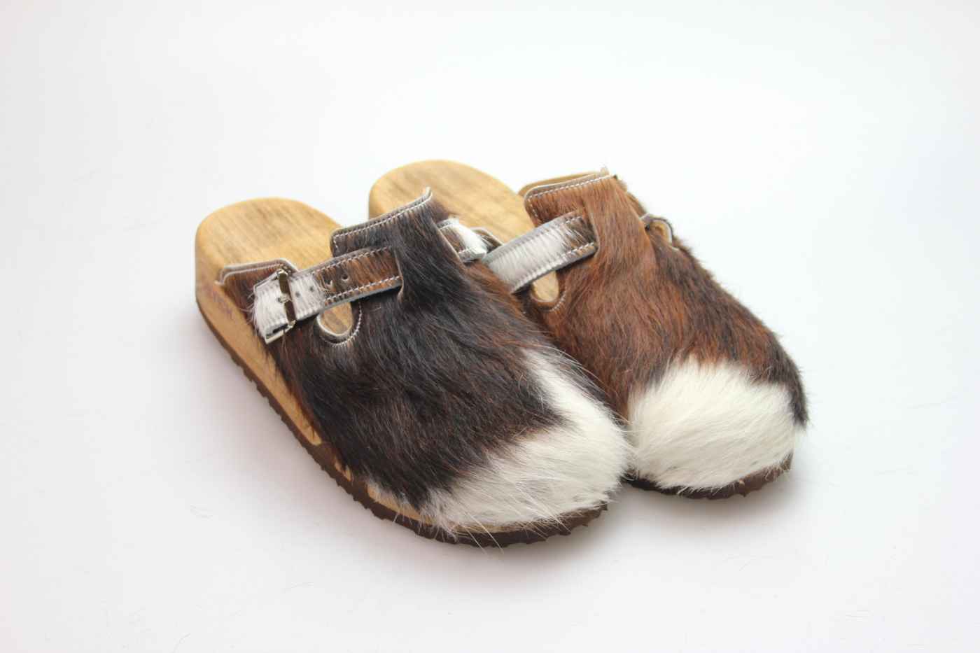 Das Obermaterial ist aus echtem Rindfell und in verschiedenen Farben erhältlich. Durch die Schnalle am Rist/Spann kann er dem Fuß angepasst werden. Im Bild sehen Sie das Exemplar, das Sie erhalten.