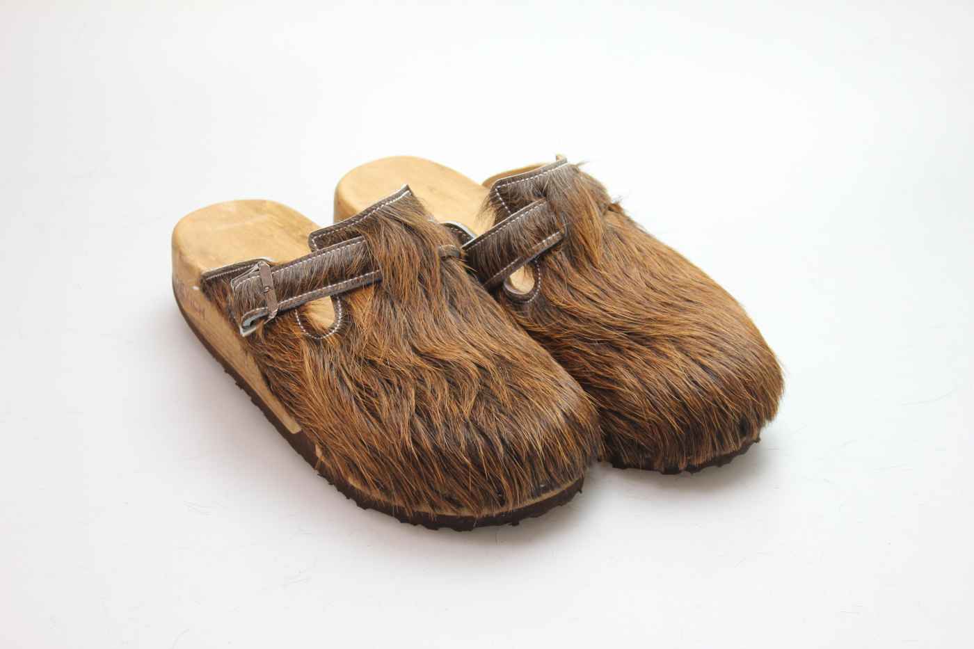 Das Obermaterial ist aus echtem Rindfell und in verschiedenen Farben erhältlich. Durch die Schnalle am Rist/Spann kann er dem Fuß angepasst werden. Im Bild sehen Sie das Exemplar, das Sie erhalten.