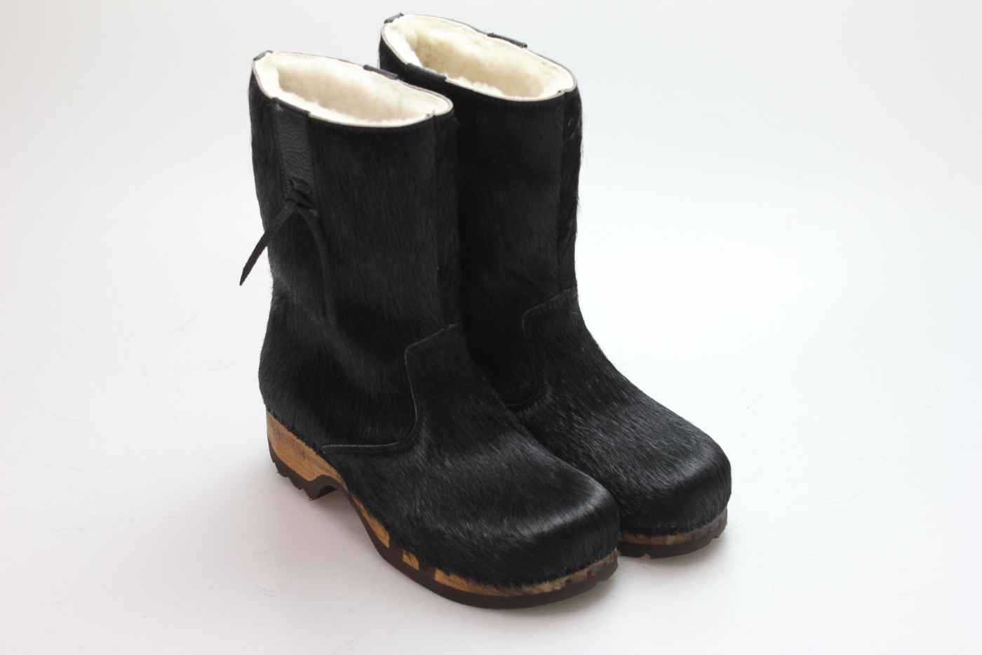 Bequemer Schlüpfstiefel aus Rindfell, mit beweglicher Holzsohle. Die Innenseite ist mit hochwertigem, echtem Schaffell verarbeitet.