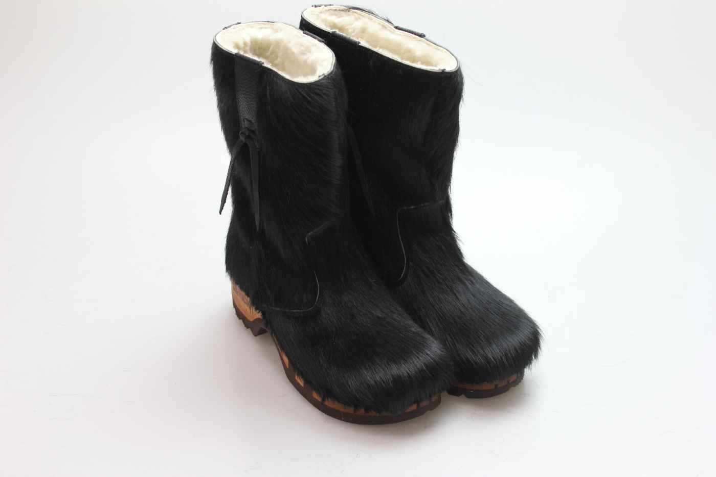 Bequemer Schlüpfstiefel aus Rindfell, mit beweglicher Holzsohle. Die Innenseite ist mit hochwertigem, echtem Schaffell verarbeitet.