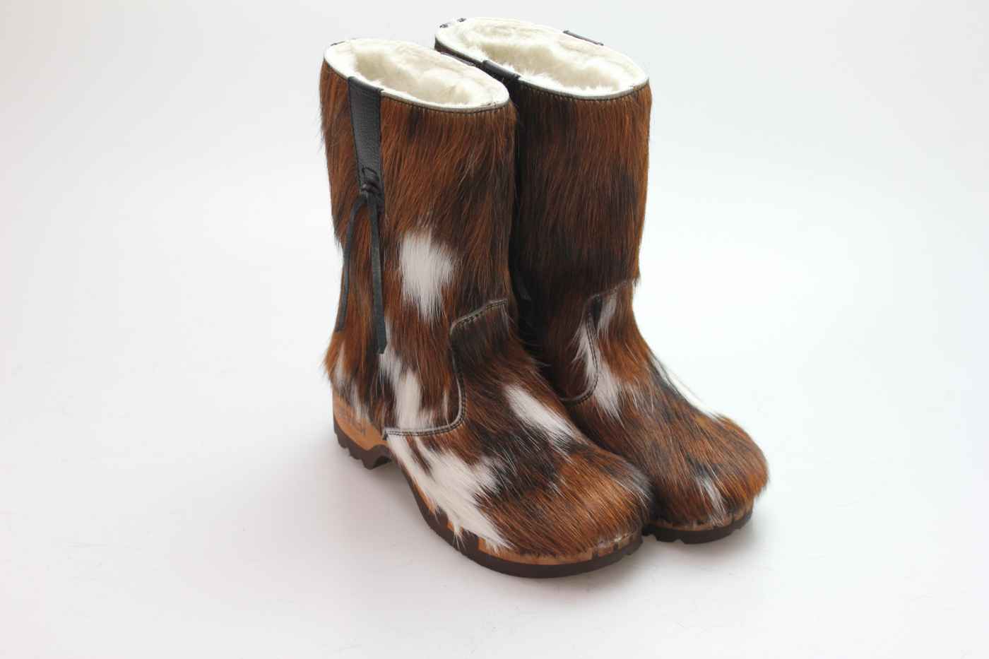 Bequemer Schlüpfstiefel aus Rindfell, mit beweglicher Holzsohle. Die Innenseite ist mit hochwertigem, echtem Schaffell verarbeitet.