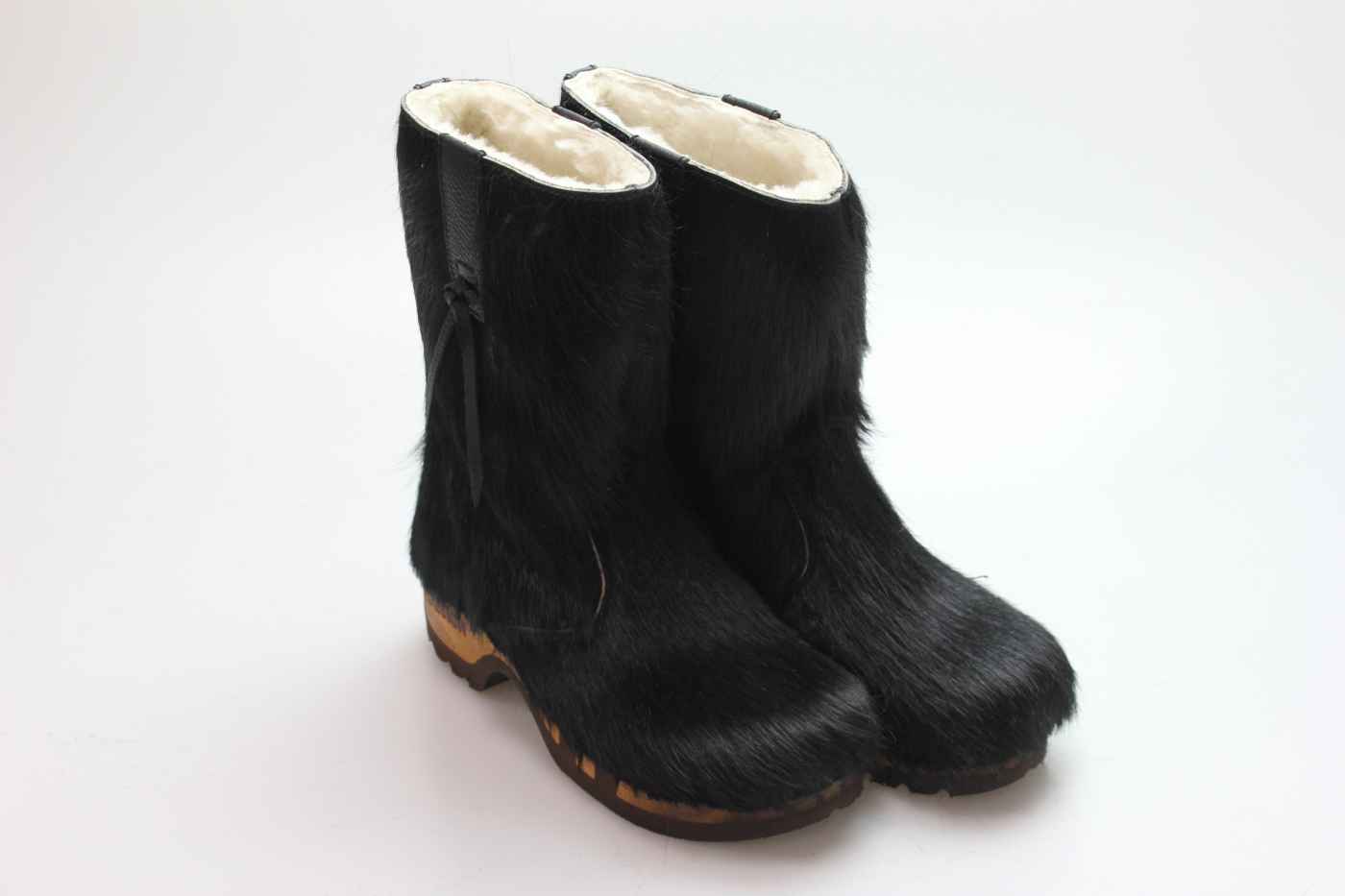 Bequemer Schlüpfstiefel aus Rindfell, mit beweglicher Holzsohle. Die Innenseite ist mit hochwertigem, echtem Schaffell verarbeitet.