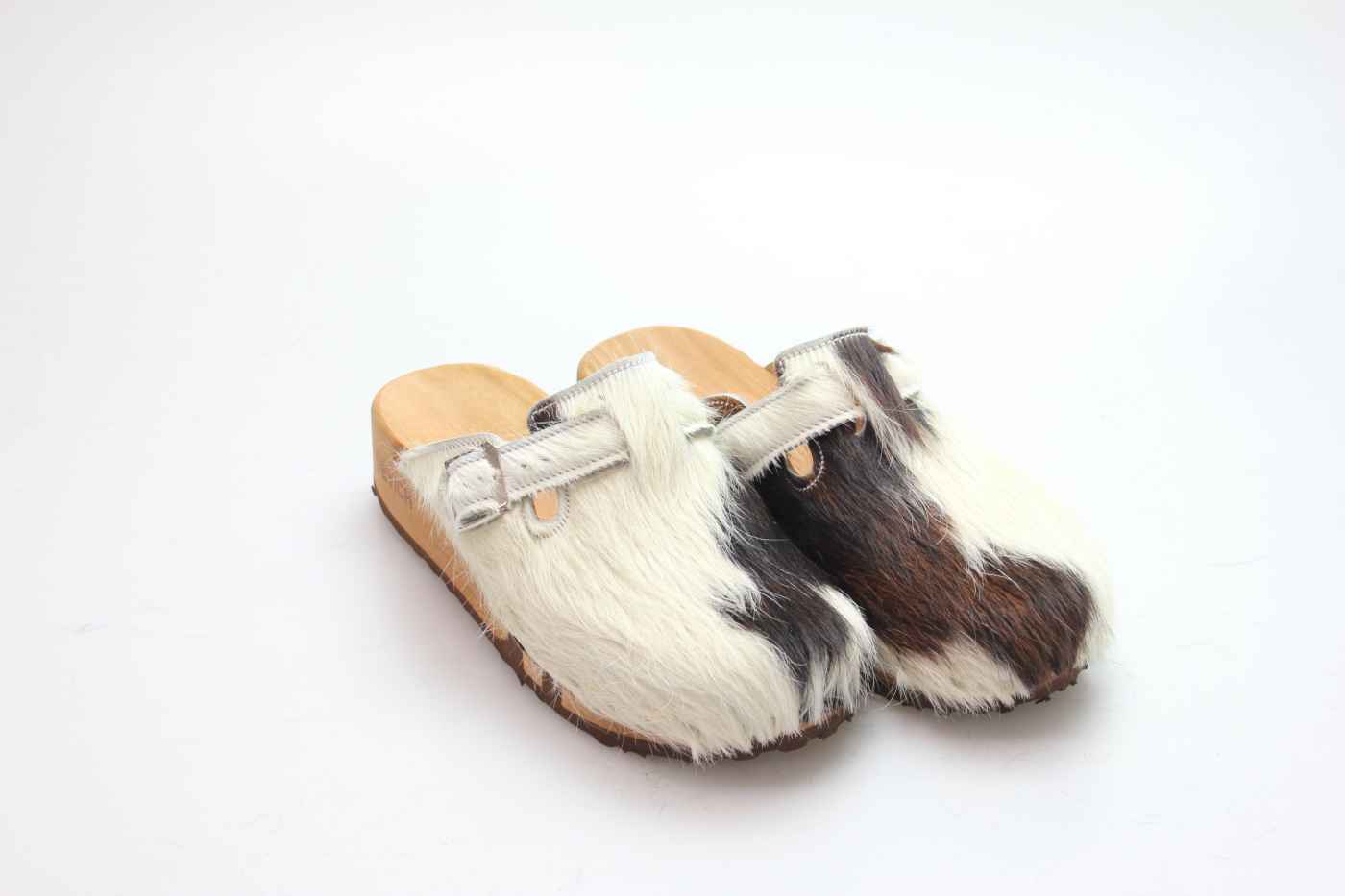 Das Obermaterial ist aus echtem Rindfell und in verschiedenen Farben erhältlich. Durch die Schnalle am Rist/Spann kann er dem Fuß angepasst werden. Im Bild sehen Sie das Exemplar, das Sie erhalten.
