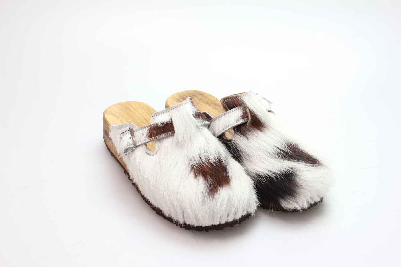 Das Obermaterial ist aus echtem Rindfell und in verschiedenen Farben erhältlich. Durch die Schnalle am Rist/Spann kann er dem Fuß angepasst werden. Im Bild sehen Sie das Exemplar, das Sie erhalten.