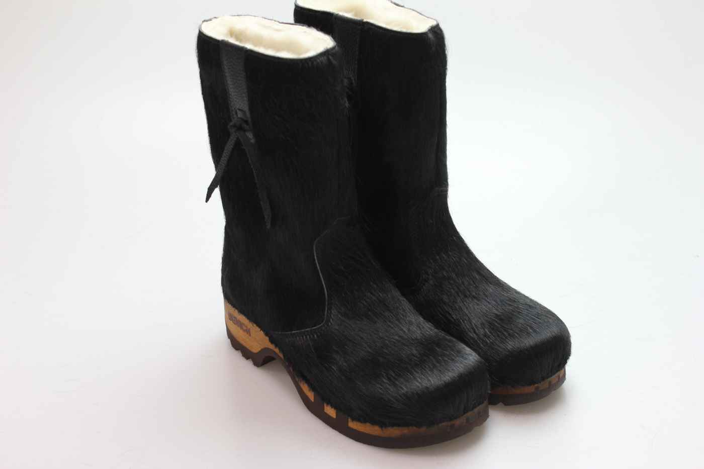 Bequemer Schlüpfstiefel aus Rindfell, mit beweglicher Holzsohle. Die Innenseite ist mit hochwertigem, echtem Schaffell verarbeitet.