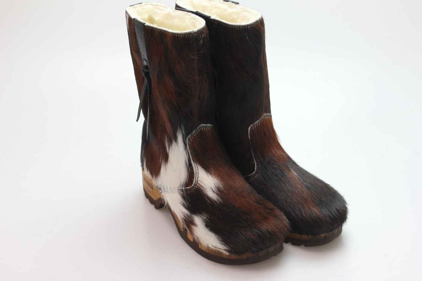 Bequemer Schlüpfstiefel aus Rindfell, mit beweglicher Holzsohle. Die Innenseite ist mit hochwertigem, echtem Schaffell verarbeitet.