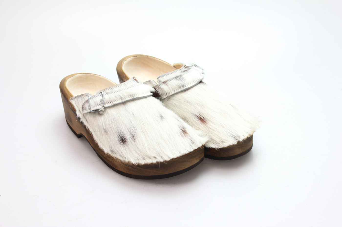 Dieser Holzschuh ist mittels einer Schnalle am Rist/Span verstellbar und ist mit einem Rindsleder gefüttert. Das Obermaterial ist echtes Rindfell. Im Bild sehen Sie das Unikat, welches Sie erhalten.