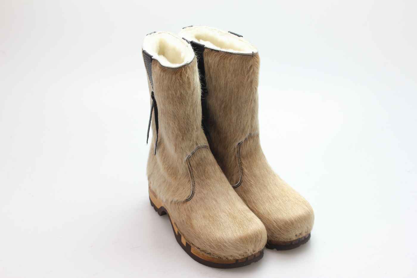 Bequemer Schlüpfstiefel aus Rindfell, mit beweglicher Holzsohle. Die Innenseite ist mit hochwertigem, echtem Schaffell verarbeitet.