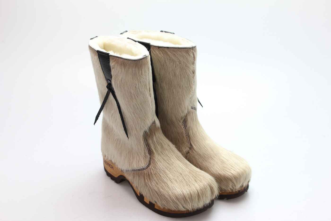 Bequemer Schlüpfstiefel aus Rindfell, mit beweglicher Holzsohle. Die Innenseite ist mit hochwertigem, echtem Schaffell verarbeitet.