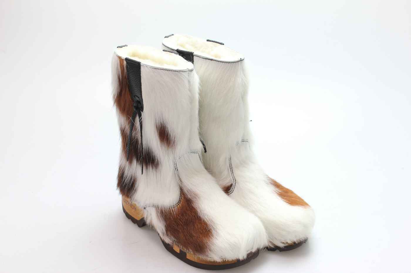 Bequemer Schlüpfstiefel aus Rindfell, mit beweglicher Holzsohle. Die Innenseite ist mit hochwertigem, echtem Schaffell verarbeitet.