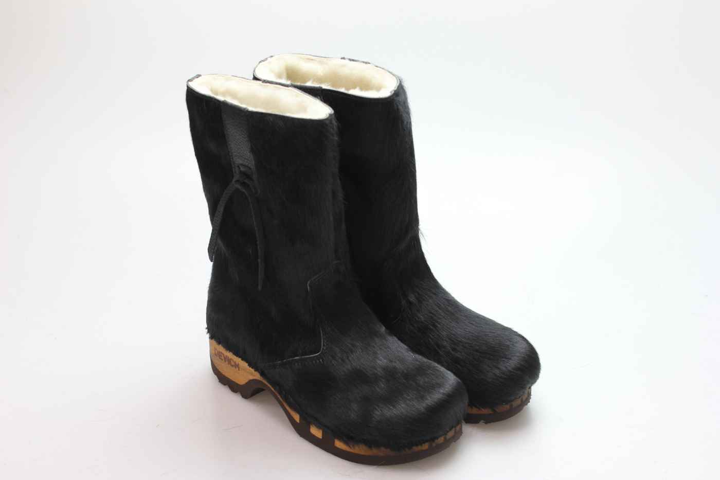 Bequemer Schlüpfstiefel aus Rindfell, mit beweglicher Holzsohle. Die Innenseite ist mit hochwertigem, echtem Schaffell verarbeitet.