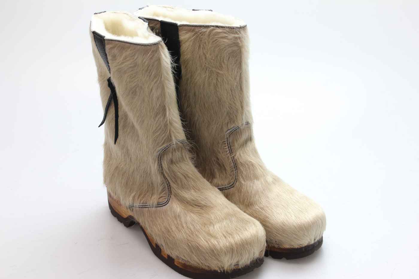Bequemer Schlüpfstiefel aus Rindfell, mit beweglicher Holzsohle. Die Innenseite ist mit hochwertigem, echtem Schaffell verarbeitet.