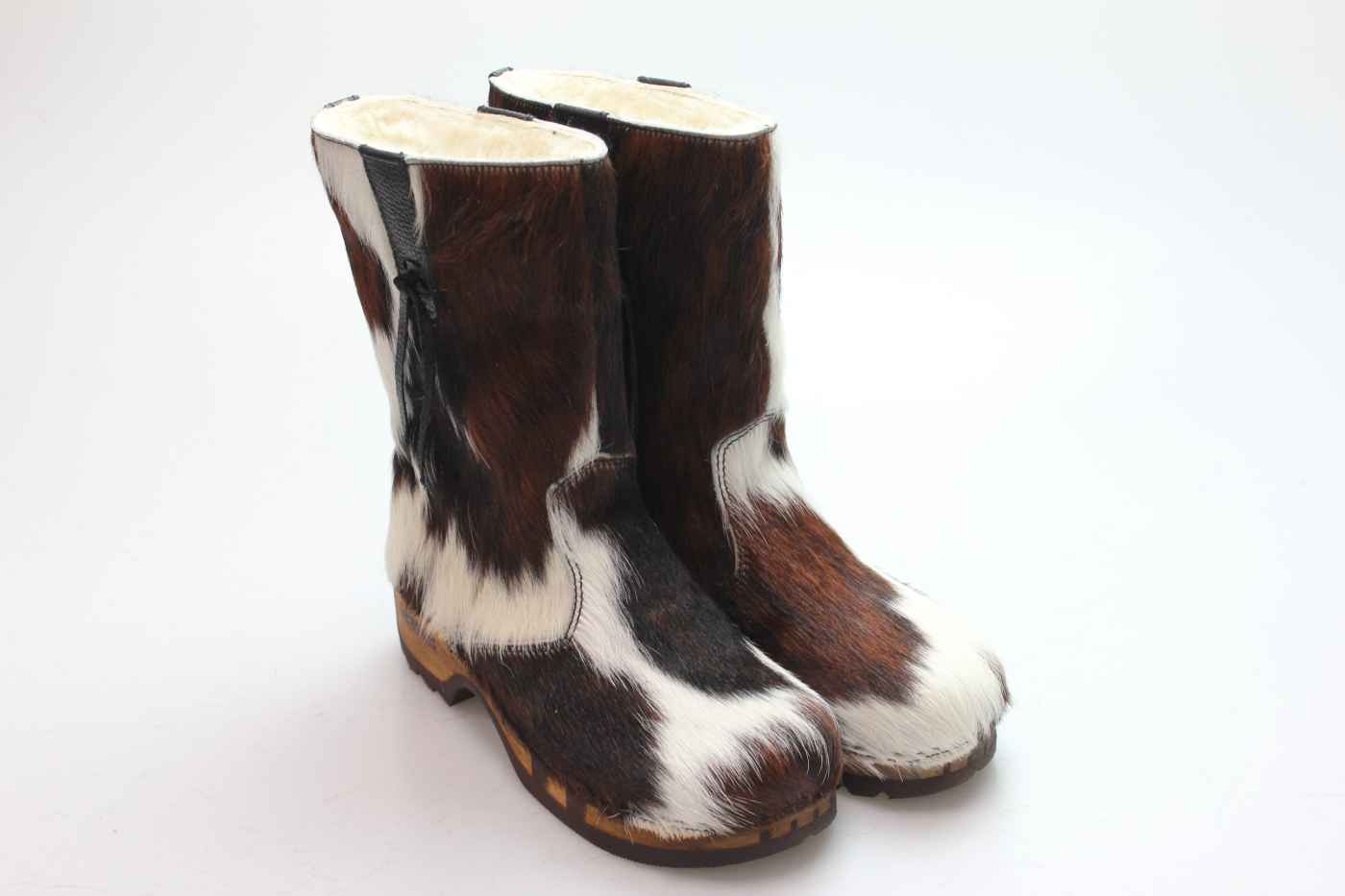 Bequemer Schlüpfstiefel aus Rindfell, mit beweglicher Holzsohle. Die Innenseite ist mit hochwertigem, echtem Schaffell verarbeitet.
