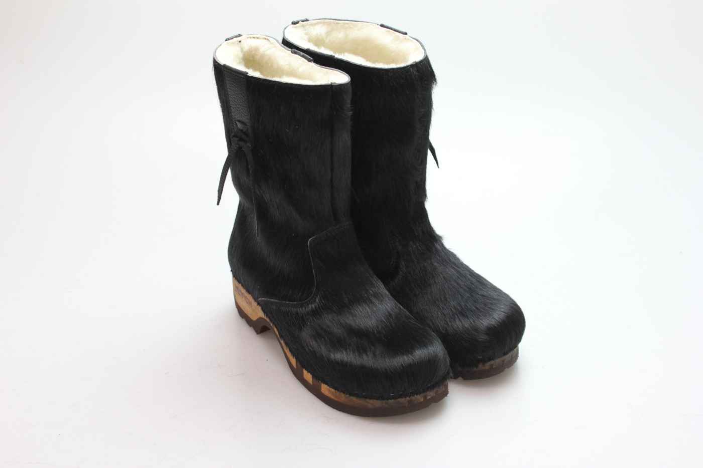 Bequemer Schlüpfstiefel aus Rindfell, mit beweglicher Holzsohle. Die Innenseite ist mit hochwertigem, echtem Schaffell verarbeitet.