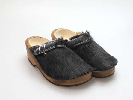 Der Holzschuh, mit dem Sie sicherlich auffallen werden. Außen verwenden wir für dieses Modell Ziegenfell. Für zusätzichen Komfort ist er auch mit Schaffell gefüttert. Im Bild sehen Sie das Unikat, welches Sie erhalten.