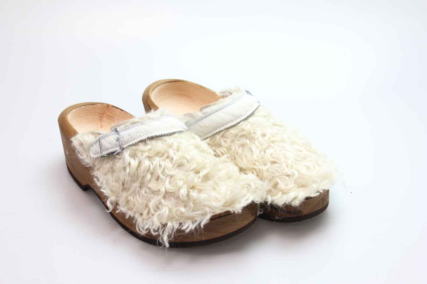 Der Holzschuh, mit dem Sie sicherlich auffallen werden. Außen verwenden wir für dieses Modell Ziegenfell. Für zusätzichen Komfort ist er auch mit Schaffell gefüttert. Im Bild sehen Sie das Unikat, welches Sie erhalten.