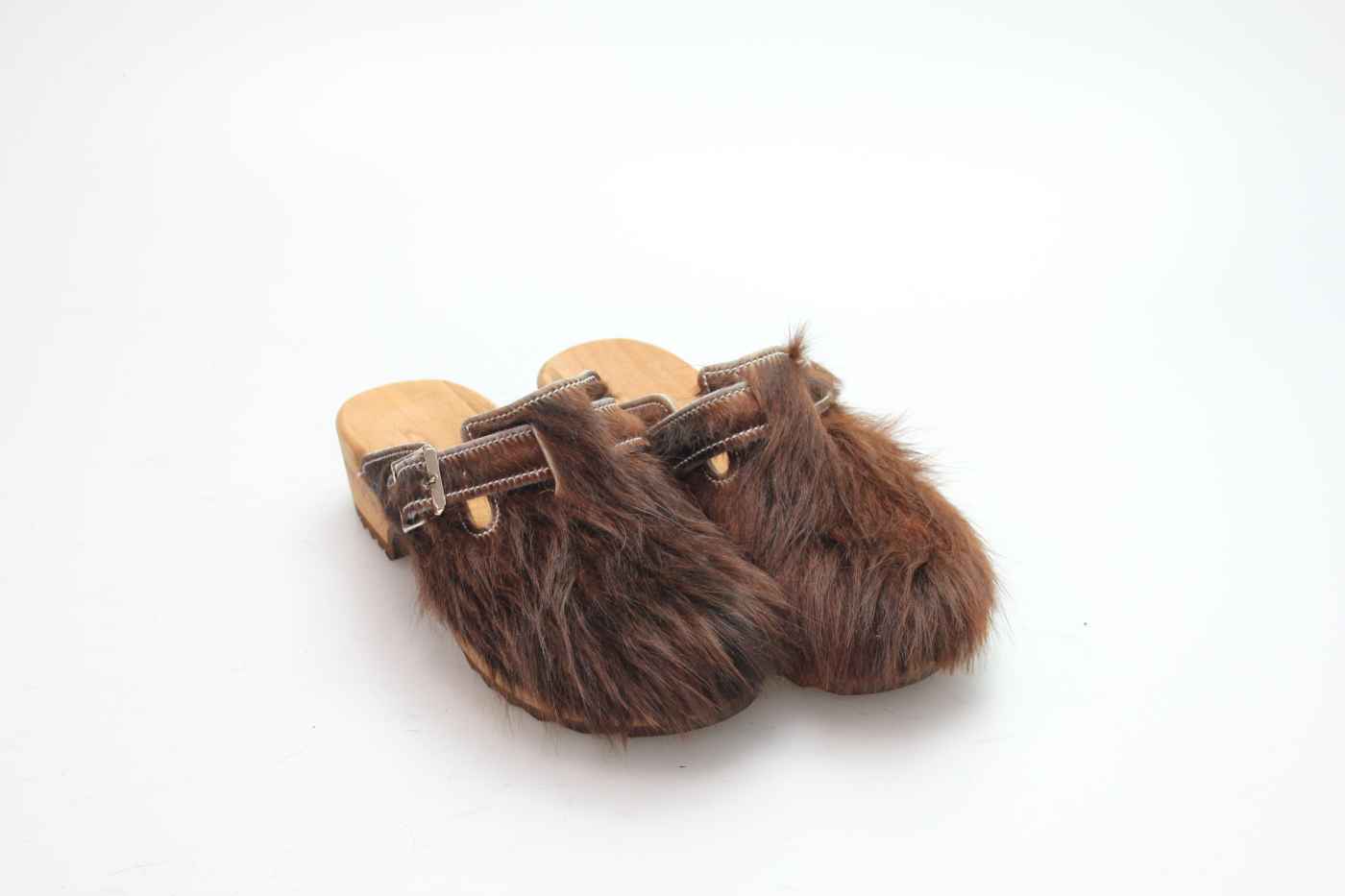 Die Holzsohle ist aus Pappelholz mit eingearbeitetem Fußbett und abriebfester Laufsohle. Das Oberleder ist aus echtem Rindfell. Durch die Schnalle am Rist/Spann kann er dem Fuß angepasst werden.