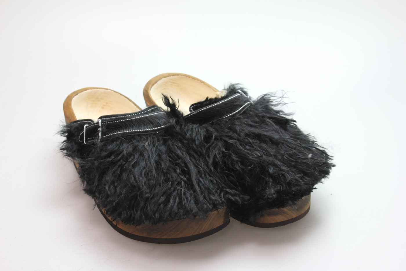 Der Holzschuh, mit dem Sie sicherlich auffallen werden. Außen verwenden wir für dieses Modell Ziegenfell. Für zusätzichen Komfort ist er auch mit Schaffell gefüttert. Im Bild sehen Sie das Unikat, welches Sie erhalten.