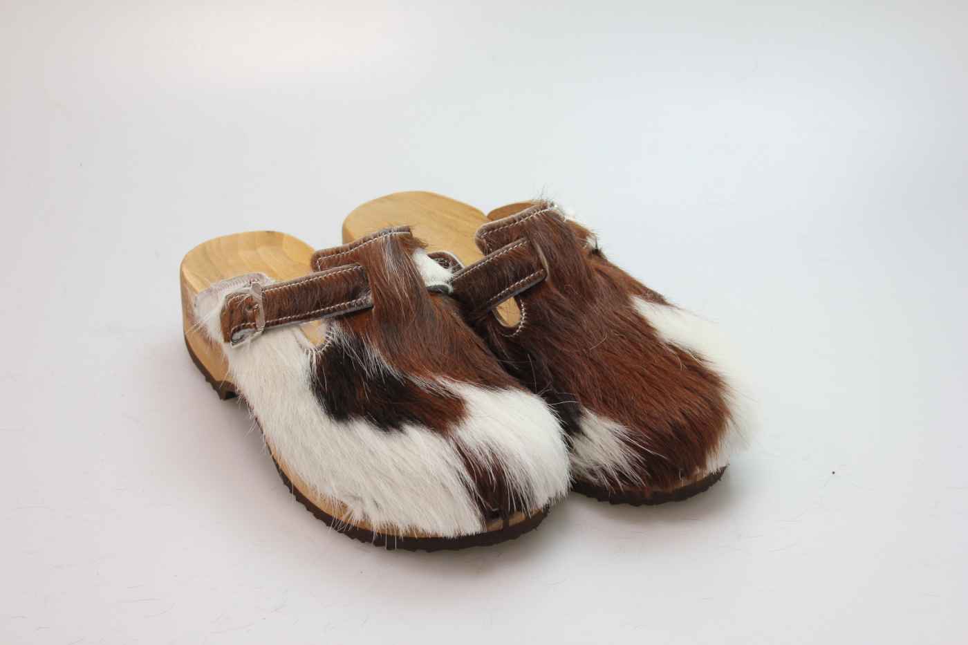 Die Holzsohle ist aus Pappelholz mit eingearbeitetem Fußbett und abriebfester Laufsohle. Das Oberleder ist aus echtem Rindfell. Durch die Schnalle am Rist/Spann kann er dem Fuß angepasst werden.