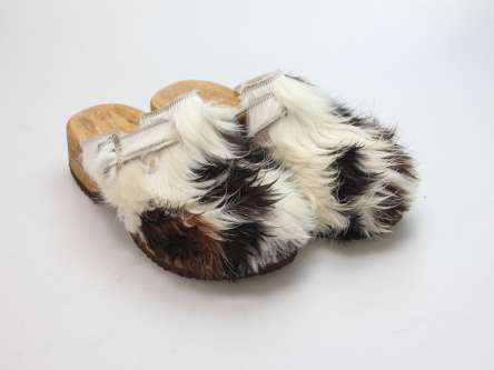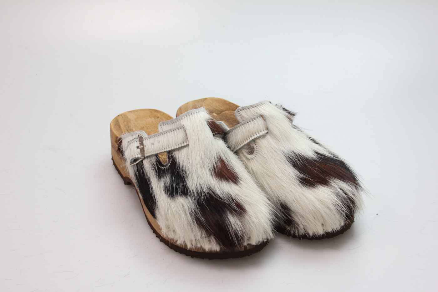 Die Holzsohle ist aus Pappelholz mit eingearbeitetem Fußbett und abriebfester Laufsohle. Das Oberleder ist aus echtem Rindfell. Durch die Schnalle am Rist/Spann kann er dem Fuß angepasst werden.