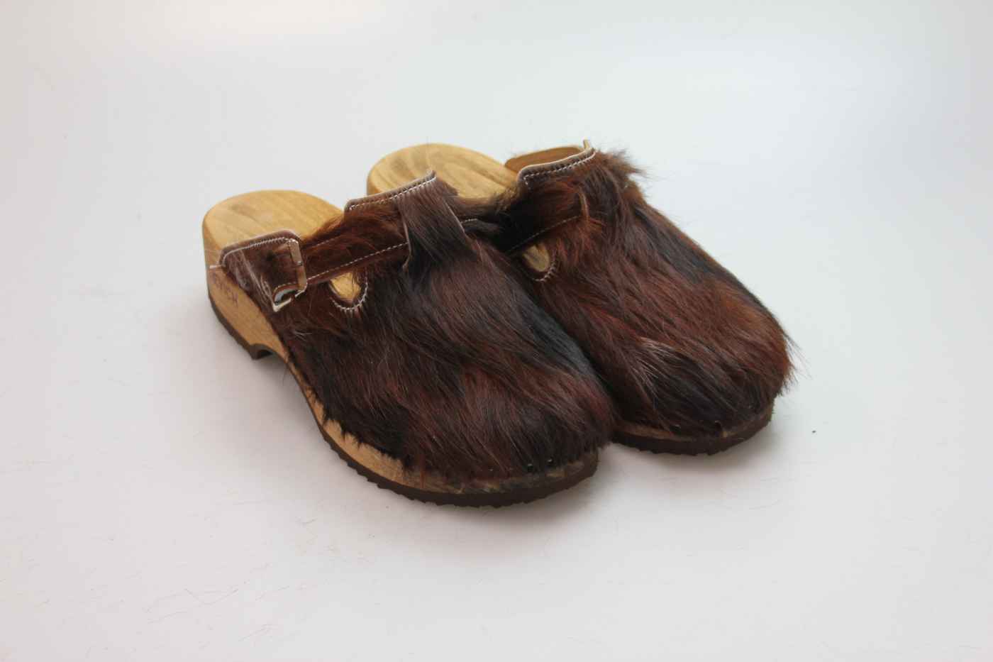 Die Holzsohle ist aus Pappelholz mit eingearbeitetem Fußbett und abriebfester Laufsohle. Das Oberleder ist aus echtem Rindfell. Durch die Schnalle am Rist/Spann kann er dem Fuß angepasst werden.