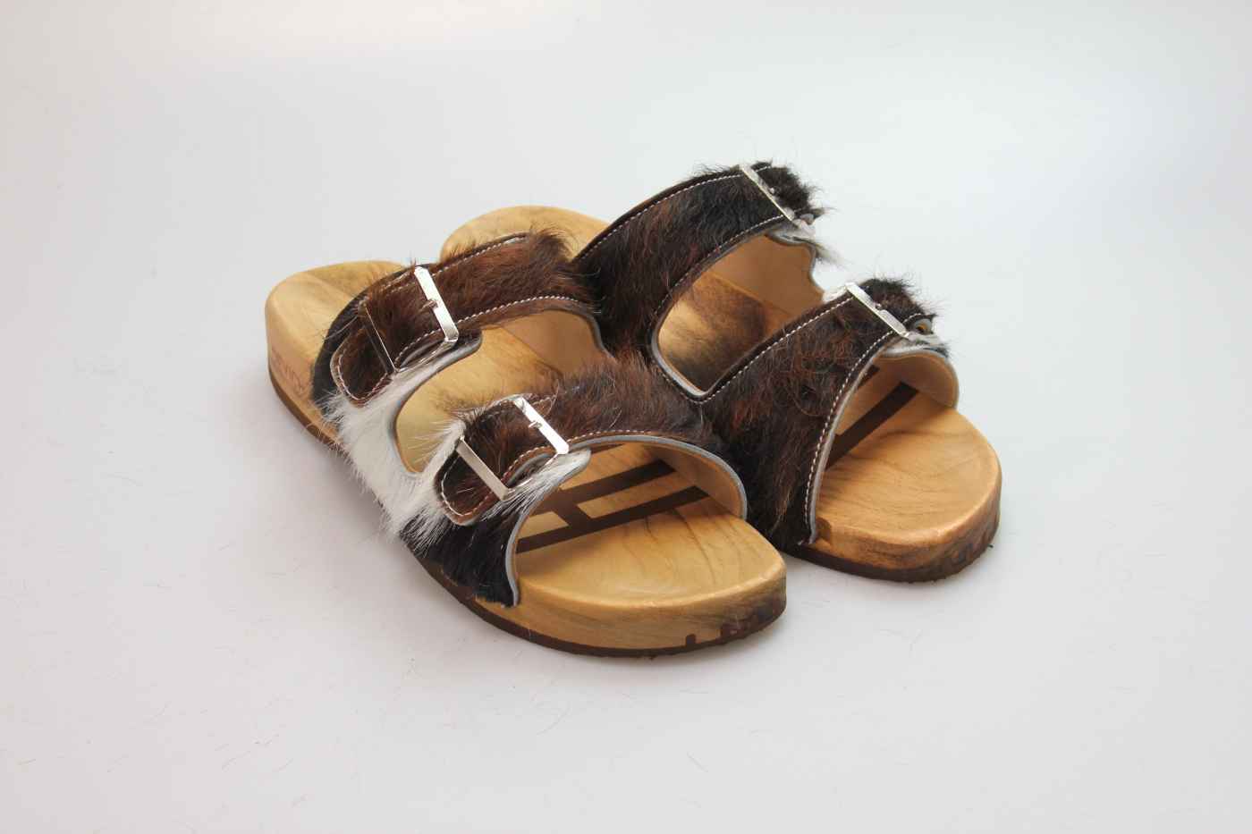 Holzsohle mit eingearbeitetem Fußbett. Die Laufsohle ist aus rutschfestem und abriebfestem PU. Durch die bewegliche Holzsohle ist die Sandale weich und leise beim Auftreten. Mittels zwei Schnallen kann sie dem Fuß perfekt angepasst werden.