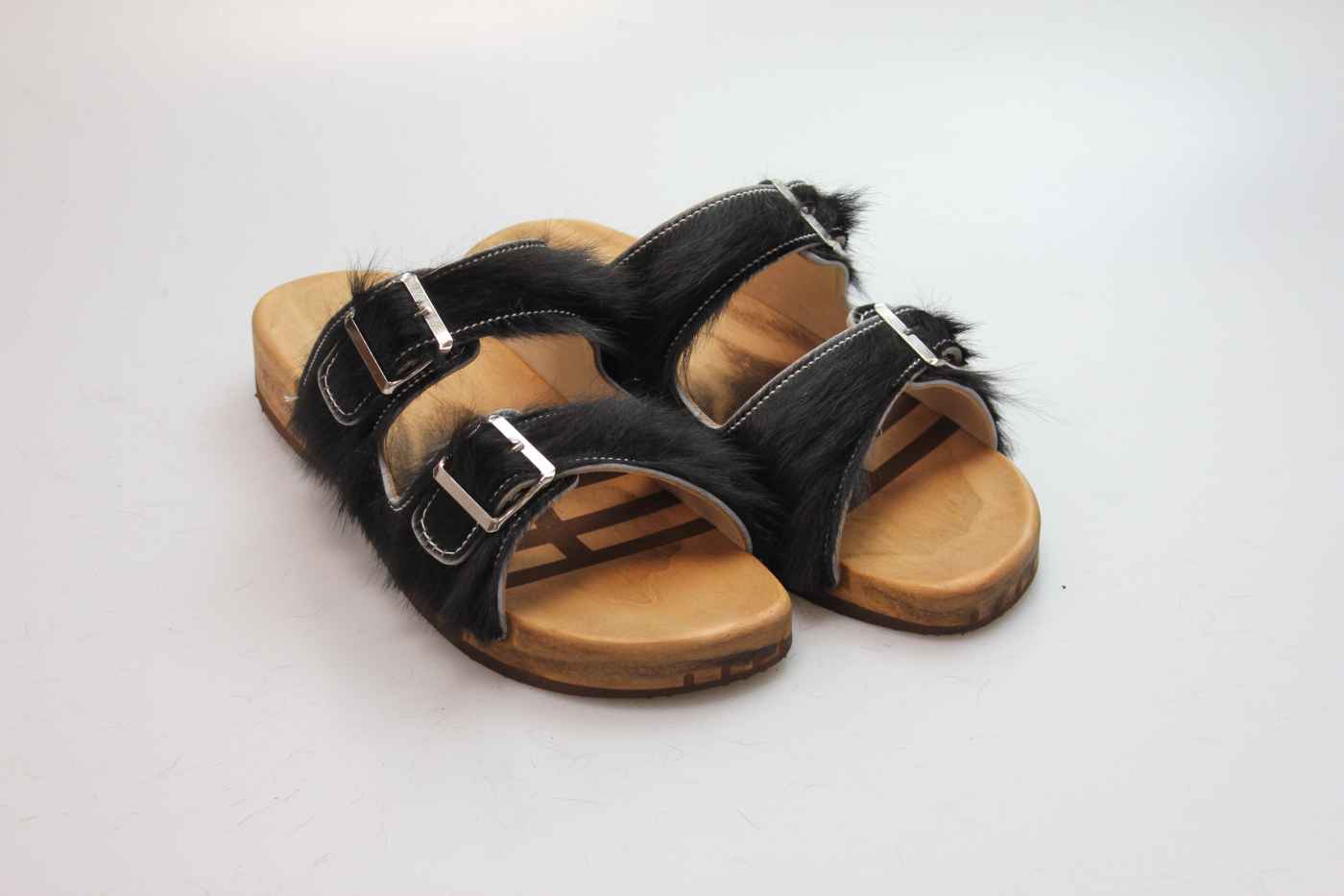 Holzsohle mit eingearbeitetem Fußbett. Die Laufsohle ist aus rutschfestem und abriebfestem PU. Durch die bewegliche Holzsohle ist die Sandale weich und leise beim Auftreten. Mittels zwei Schnallen kann sie dem Fuß perfekt angepasst werden.